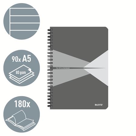 Spirálfüzet, A5, vonalas, 90 lap, PP borító, LEITZ "Office", szürke