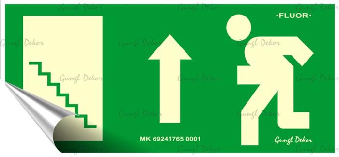 Információs matrica, 25x11,5 cm, fluoreszkáló, utánvilágítós, "Menekülési irány fel, lépcső balra"